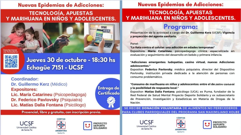 El próximo jueves 30 de octubre a las 18:30 hs, se llevará a cabo en la Universidad Católica de Santa Fe, el seminario “Nuevas Epidemias de Adicciones: Tecnología, Apuestas y Marihuana en Niños y Adolescentes”, un encuentro destinado a reflexionar sobre los desafíos contemporáneos en salud mental infantojuvenil.